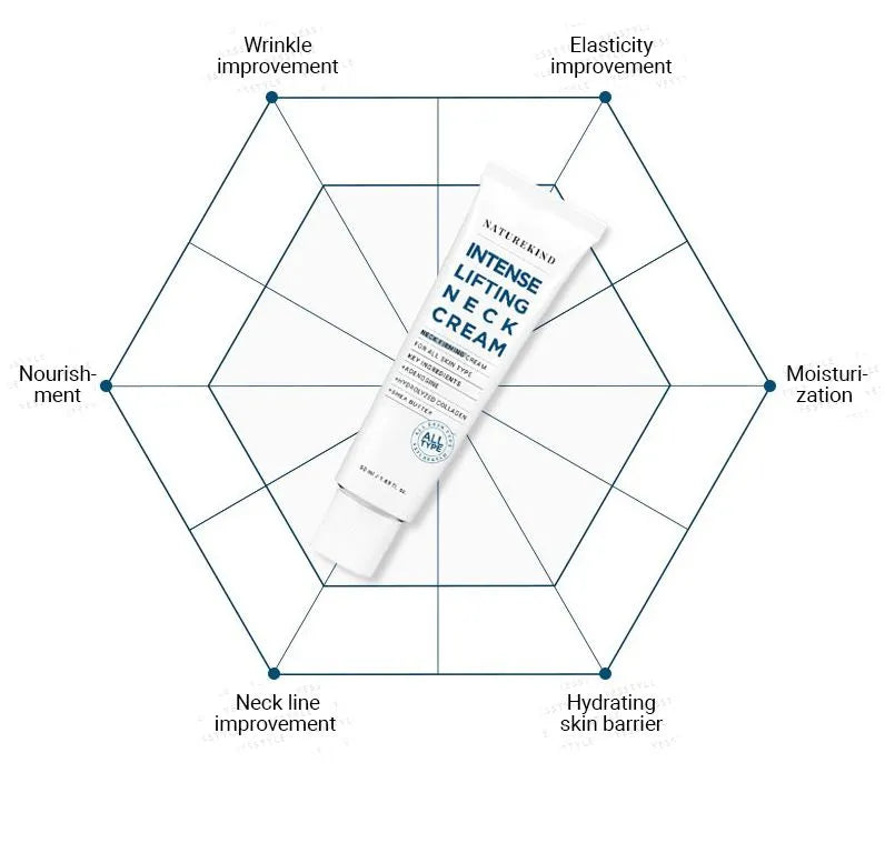 Naturekind Intense Lifting Neck Cream is scientifically formulated to tighten and lift the delicate skin on your neck. Our advanced formula, enriched with natural ingredients, provides an intense, hydrating boost for smoother, younger-looking skin. Achieve a firmer and more radiant neck with Naturekind.